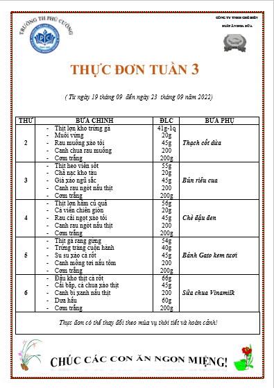 THỰC ĐƠN BÁN TRÚ TUẦN 3 THÁNG 9 NĂM HỌC 2022 - 2023