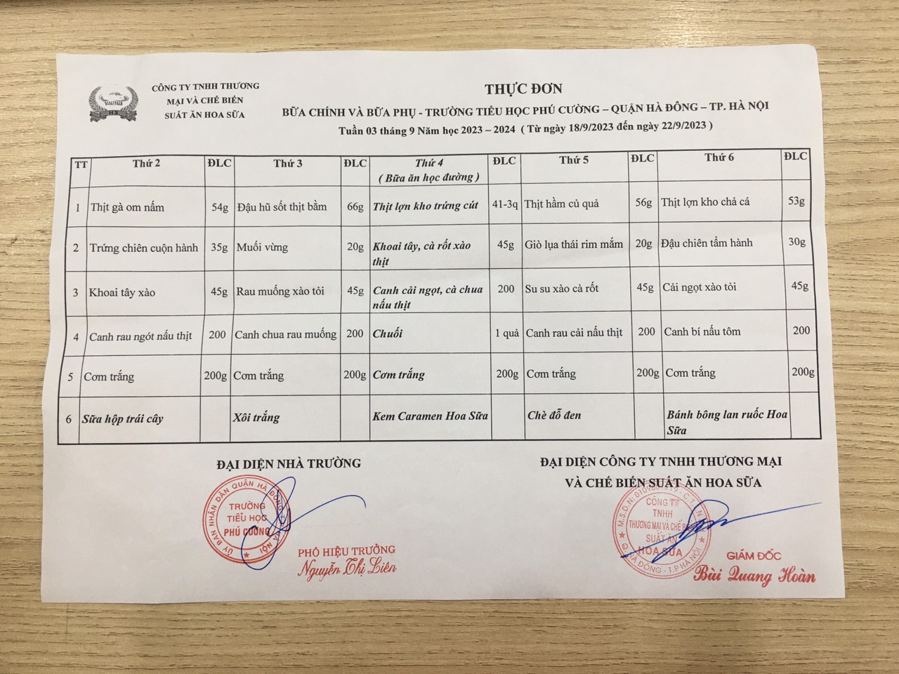 Thực đơn áp dụng từ ngày 18/9 đến ngày 22/9/2023.