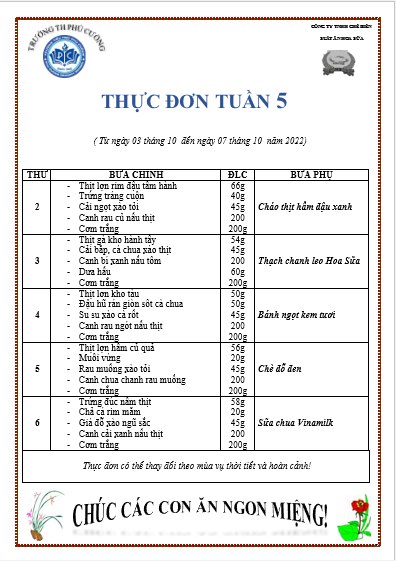 THỰC ĐƠN TUẦN 5 THÁNG 10 NĂM HỌC 2022 - 2023