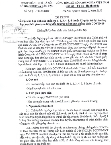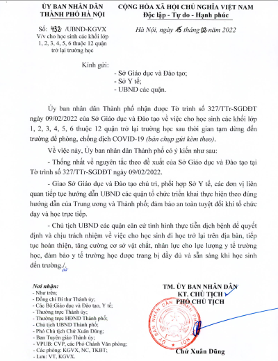 Kính gửi Quý phụ huynh, các cán bộ, nhân viên nhà trường Công văn số 432/UBND-KGVX ngày 15/2/2022 của UBND Thành phố Hà Nội về việc cho học sinh các lớp 1,2,3,4,5,6 thuộc 12 quận trở lại trường học!